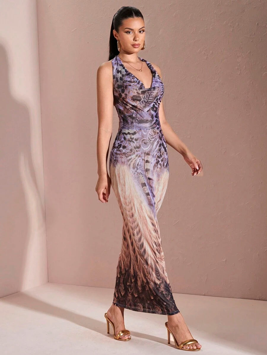 SHEIN BAE – Robe élégante à col drapé et imprimé animal, coupe queue de poisson